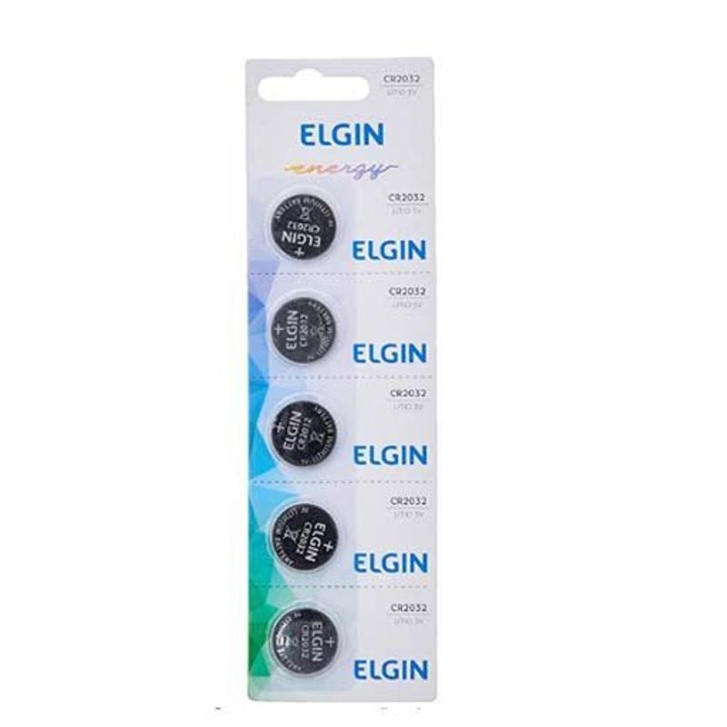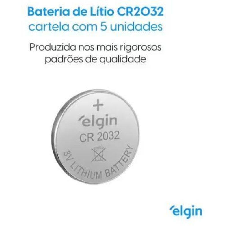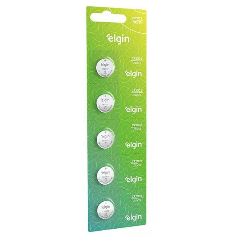A Bateria CR2032/A76 3V Elgin vem com 5 unidades, indicada para dispositivos como calculadoras e câmeras de vigilância.