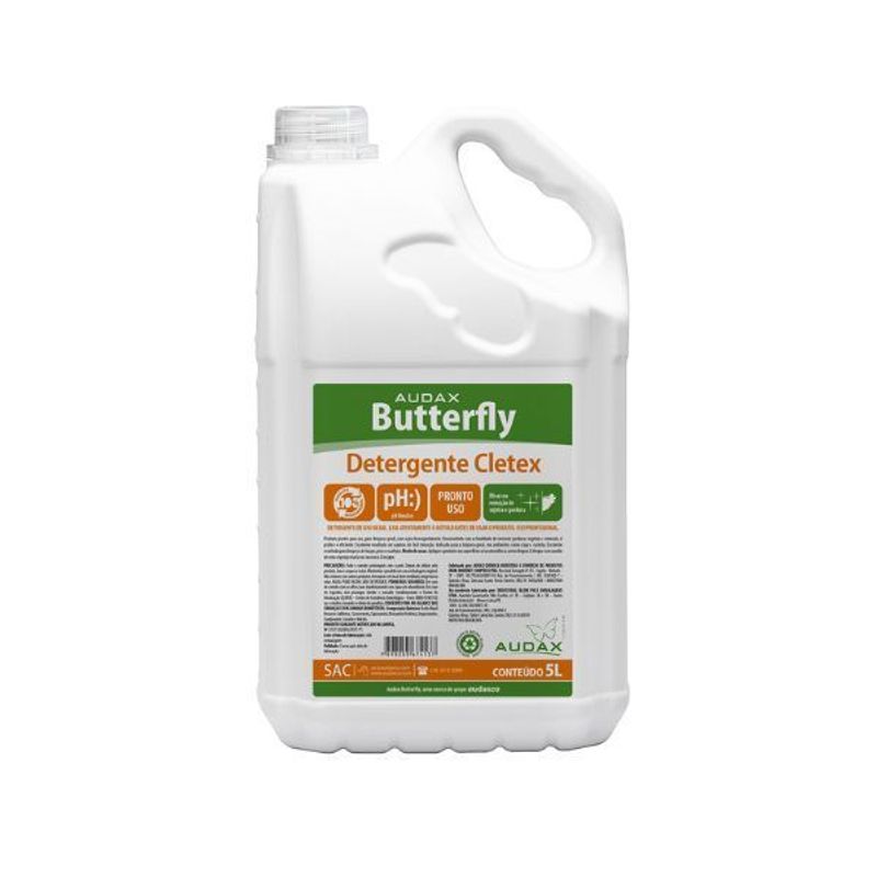 O detergente líquido Cletex da Butterfly é um produto neutro e eficaz, ideal para remoção de sujeiras em louças, utensílios, superfícies em geral e pisos laváveis. Com fórmula suave e alto rendimento, pode ser utilizado em ambientes domésticos, institucionais e comerciais. A embalagem de 5 litros é prática e econômica, oferecendo excelente custo-benefício para o uso diário.