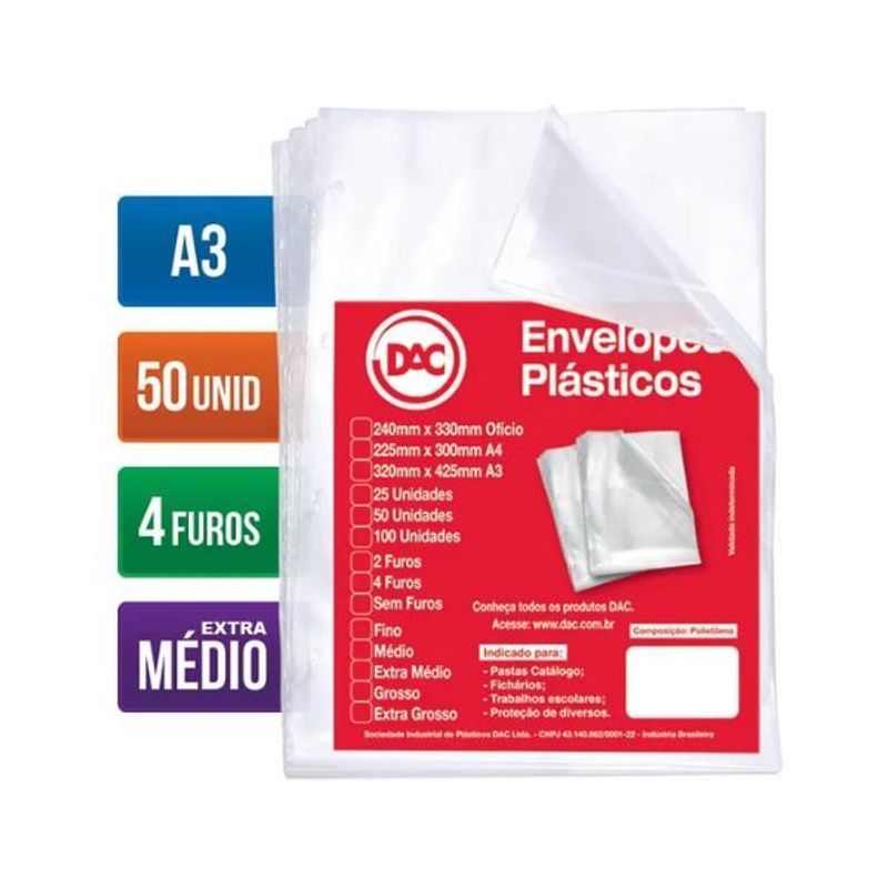 O Envelope Plástico Dac tamanho A3 é ideal para proteção e organização de documentos grandes. Com espessura de 0,12 mm, oferece resistência e durabilidade, enquanto os 4 furos permitem arquivamento em fichários padrão. Transparente, facilita a visualização do conteúdo sem a necessidade de abrir o envelope. Pacote com 50 unidades, perfeito para uso em escritórios, escolas e ambientes corporativos.