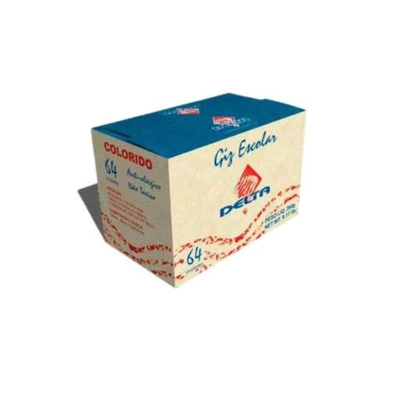O Giz Escolar Colorido Delta vem em embalagem com 64 unidades, ideal para uso em escolas e atividades educativas.