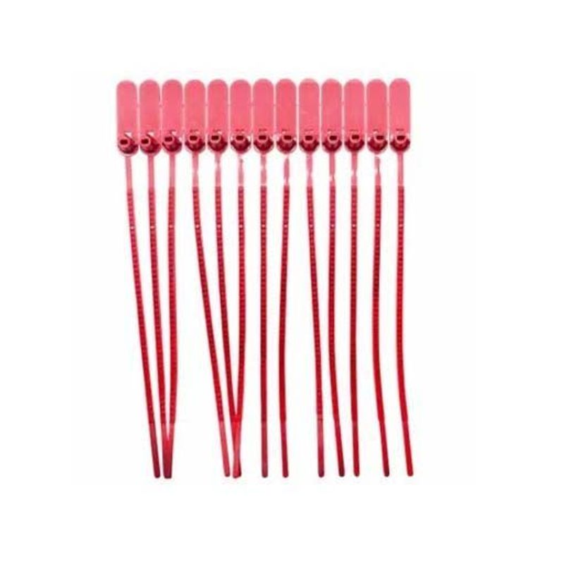 Lacre para malote com 16 cm de comprimento, na cor vermelha, fornecido em pacotes de 100 unidades. Garantia de segurança no fechamento de malotes e documentos.