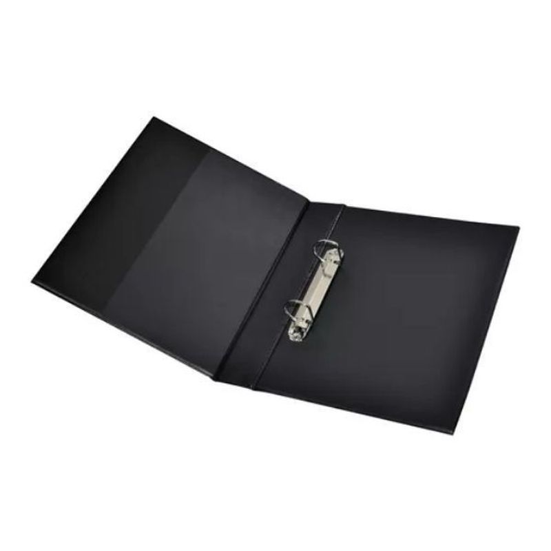 Pasta escolar preta com 2 argolas para organização de documentos escolares e outras tarefas.